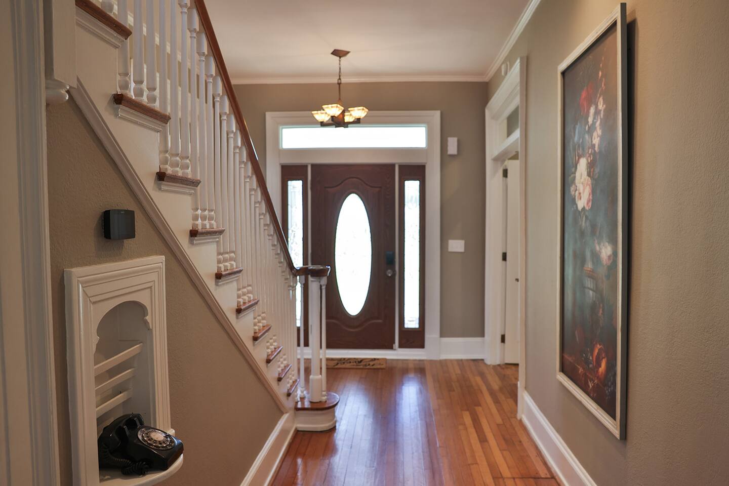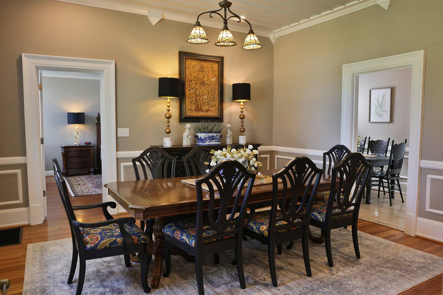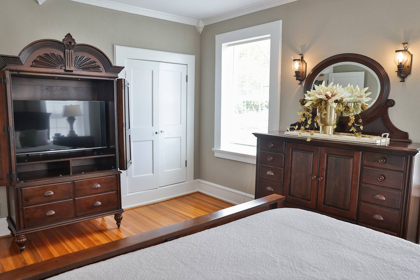 As you walk in the front door of this 100 year old home, you will love the gleaming hardwood floors , tall ceilings, huge rooms with tons of crown moldings and beautiful architecture throughout. On the main floor you have the large living room with a new couch, loveseat and a swivel chair with new coffee and end tables, a gorgeous fire place with new ventless gas logs and a large 60 inch Smart Tv sitting atop the mantle. Just past the living room is a beautiful and spacious home office with a large executive style desk with hutch and 2 blue Queen Anne wing back chairs with a Pembroke table in between. The office also has tons of windows and natural light and comes with a comfortable desk chair if you need to do a little work while away from home. On the left side of the foyer is a very generous dining room and comes furnished with a large dining table with 8 chairs, a matching sideboard with a great pair of Forty West Lamps and a blue willow foot tub with nice greenery. The dining room boast a stained glass light fixture and a small server with a nice pair of Staffordshire dogs. Just behind the dining room is a small breakfast nook with a table and 5 chairs and some extra cabinetry for storage. Just past the dining room is a large King suite with a beautiful mansion style King bed, 2 large granite top side tables and a large triple dresser and mirror. This bedroom also comes with a large fireplace with a brick hearth and a new set of ventless gas logs and a long mantle with a 55 inch Smart Tv resting on top of it. This room has its own private entrance door is the only bedroom on the first floor. The kitchen is located at the back of the first floor behind the breakfast nook and features tile floors, granite countertops, new stainless appliances including a double door refrigerator, smooth top electric stove, dishwasher, microwave and a Keurig coffee pot. It comes stocked with plenty of cooking utensils, silverware, pots and frying pans and some oils and spices in case you would like to prepare a nice homecooked meal. As you leave the kitchen you go to back of the house and there is a very spacious laundry room with a large capacity washer and dryer with plenty of clothes washing liquid and bleach and a nice iron and board if you need to spruce up your clothes. This room has new LVP flooring also has a partially exposed brick wall which adds a little charm to this space. Just off the foyer on the main floor, there is a full bathroom with a fully tiled walk in shower, a new vanity and toilet and a basket with make up washing cloths, soaps, lotion and extra tootbrush and toothpaste in case you forget yours. All bathrooms have a nice supply of towels and rags and extra toiletries. As you go upstairs you will love the beautiful winding staircase with a huge abstract picture on the right side and an old canvas portrait picture on the left side of the stairwell. At the top of the steps there is a nice full length mirror adjacent to the hall bathroom. The hall bathroom features tile floors and a nice tub/ shower combination, a very ornate vanity, a nice storage cabinet with a recessed mirror and plenty of extra toiletries and a hair dryer in case you forget yours. The master bedroom is furnished with a nice Mahogany King size bed, a large dresser, a nice chest with a hanging mirror and 2 mahogany night stands. It also has a nice wing back chair if you want to relax and read a book and comes with a large 60 inch Smart Tv. This room has some nice pictures and wall decor and the master bath has tile floors, a stand up shower, pedestal sink and plenty of extra toiletries if needed. Across the hall just past the hall bathroom are two more bedrooms. Bedroom 4 also features a beautiful King bed with 2 large side tables with pullout trays, a nice triple dresser and mirror and a large entertainment center with a Smart Tv as well. This bedroom has beautiful crown and base moldings, a large floral picture and some original exposed brick behind the bed which adds a nice touch to this bedroom. Bedroom 3 features a gorgeous, heavily carved French style Queen bedroom suit with 2 side tables and and heavily carved chest with a Smart tv on top. This is one of the prettiest bedroom suits I have seen and you will love how it looks in this upstairs bedroom. There is also a closet at the top of the stairs beside this bedroom that holds extra towels, wash cloths, sheets etc. The exterior of this property features a nice and level front yard with some nice landscaping and flower beds. At the rear of the house is a large paved parking lot with plenty of room to park your cars or trucks and a lovely pergola with an outdoor table and 6 chairs if you need to get some fresh air. This property is located in the heart of Anniston less than a mile from the entertainment district in downtown Anniston.