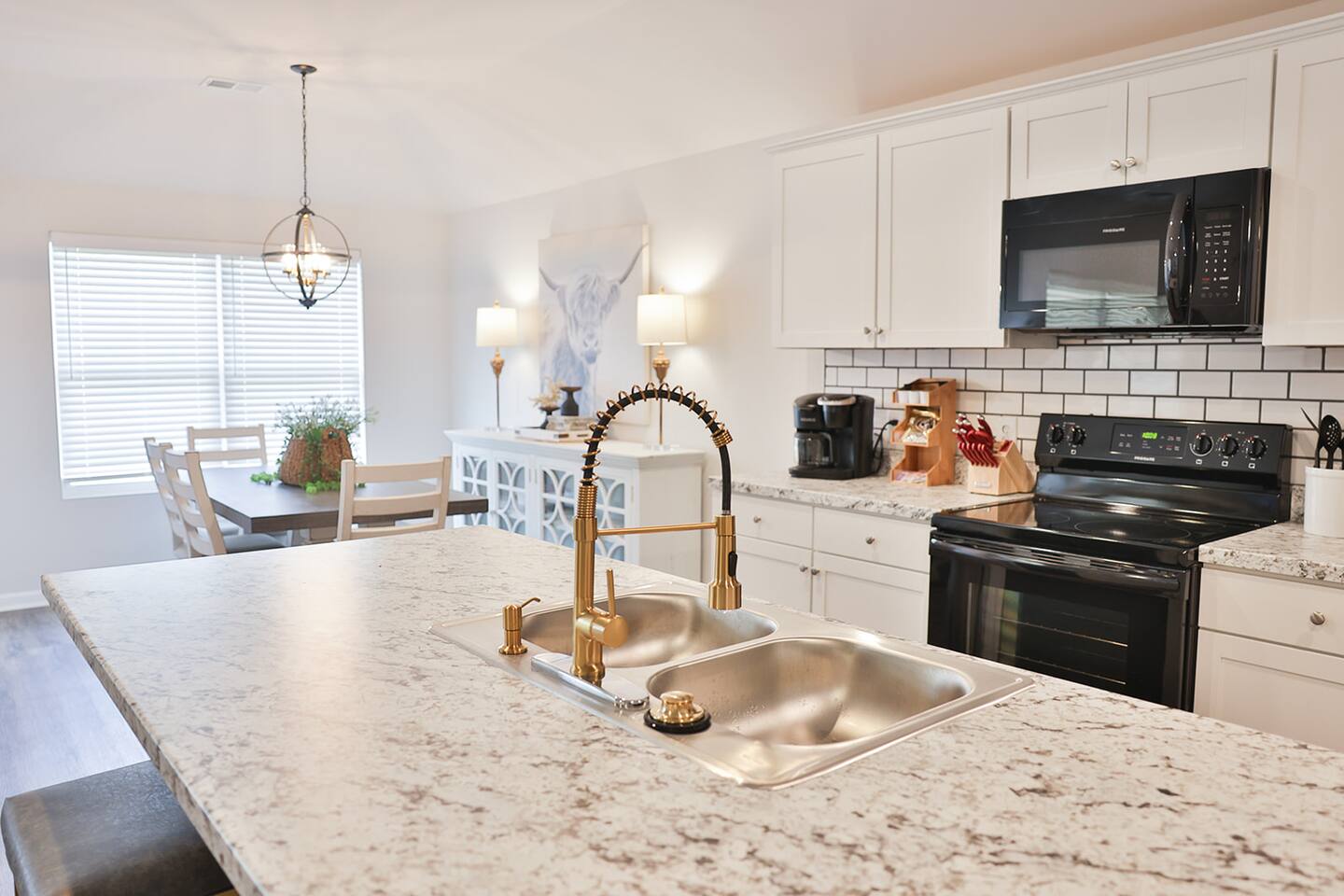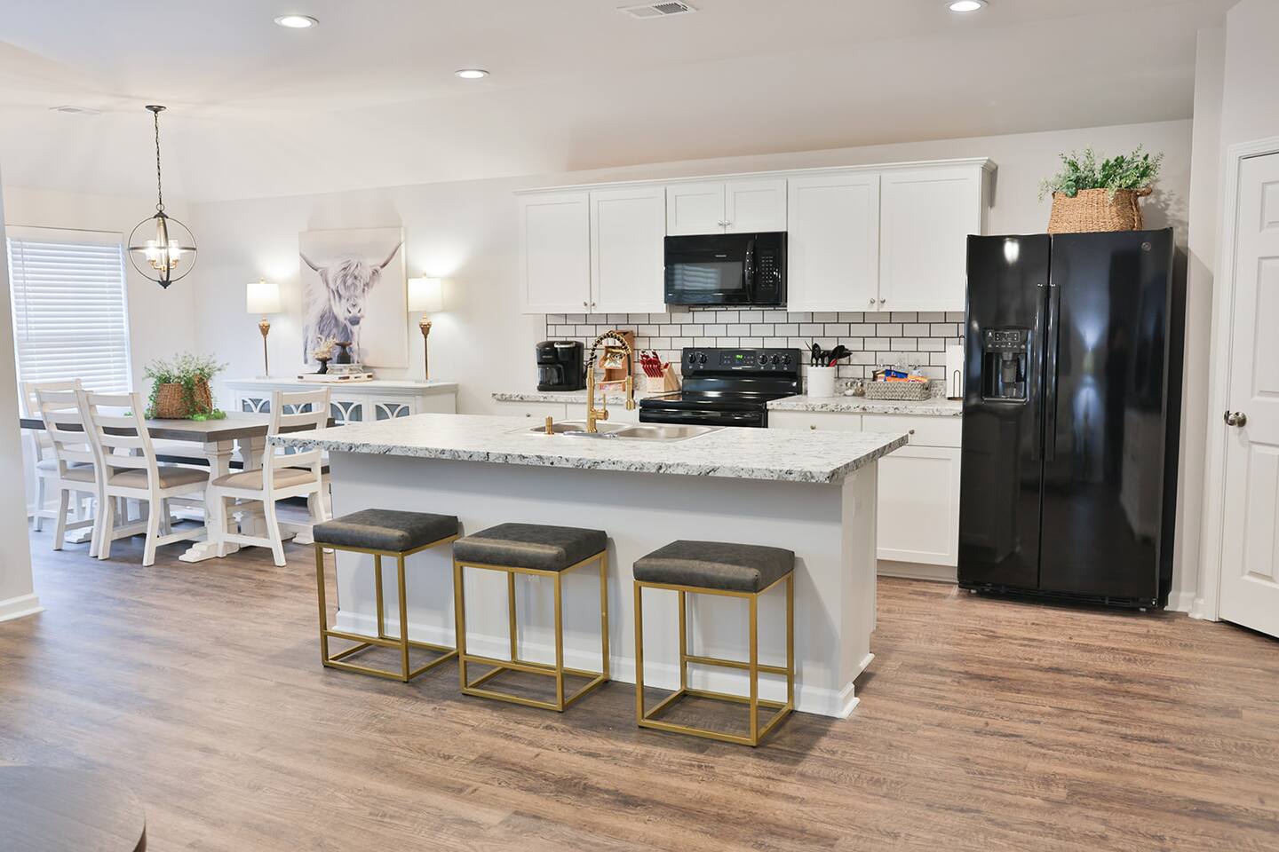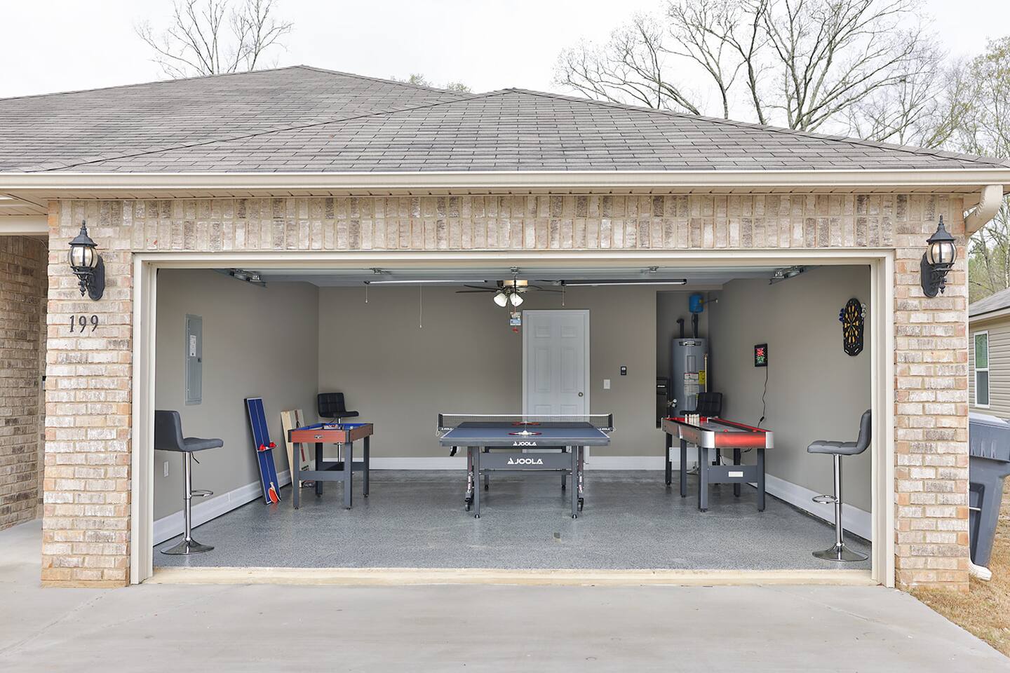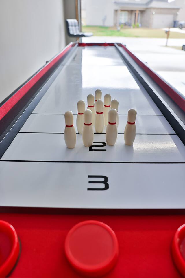 Beautiful new construction 4 bedroom home located in a very nice, family friendly neighborhood just minutes from I-20. This gorgeous home features the very popular open concept between the living room, dining room and the spacious kitchen. The living room features a new couch and matching loveseat, a round coffee and two end tables and a large 65 inch Smart Tv. The kitchen has bright white cabinets and lots of counter space with all new black appliances including a double door refrigerator, smooth top stove, dishwasher and microwave and comes fully stocked with smaller appliances including a toaster, blender and Keurig coffee maker. The kitchen also comes stocked with plenty of dishes and silverware, frying pans and bowls to cook a nice, home cooked meal. The dining room features a nice table with 4 chairs and a bench and a nice matching sideboard with stylish Forty West lamps. Just off the living room is the master bedroom with a new King size bed, chest, dresser and 2 night stands and also a nice desk and stool to work from if needed. The master bath has a tub shower combo, a nice vanity with a sitting bench and a nice size walk in closet. The second bedroom has a queen bed with 2 nightstands and a chest located inside the closet. The third bedroom also has a queen bed with 2 nightstands and a chest in the closet and the fourth bedroom has a full size bed with a dresser and mirror and a night stand and all 4 bedrooms come equipped with 43 inch Smart TVs and both bathrooms have extra toiletries including toothpaste and brush, hair dryer, soap, shampoo and conditioners just in case you forget something. The garage has been converted to a nice NASCAR themed GAMEROOM with a ping pong table, darts, cornhole, a 3 in 1 table with bowling, air hockey and shuffleboard and a child’s 3 in 1 table with a pool table, air hockey and ping ping. The rear patio also comes equipped with an outdoor couch, 2 chairs and a coffee table to enjoy your morning coffee. This home is very conveniently located to I-20, Honda, the Talladega Superspeedway, the world class Civilian Marksmanship Park in Talladega and just minutes from Logan Martin Lake and the Lincoln Landing Tournament Fishing Park. Plenty of restaurants, gas stations, grocery stores etc within a mile or two and the nice and new Lincoln City park with tennis, basketball and pickle ball courts, kids playground and a nice walking track that is less than a mile away.