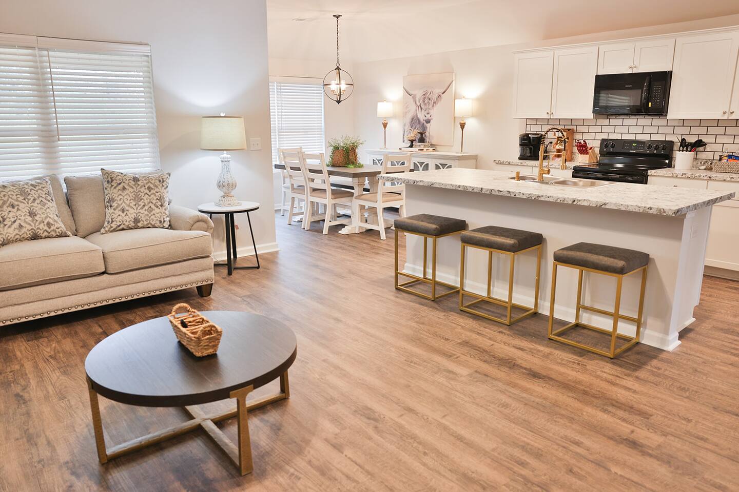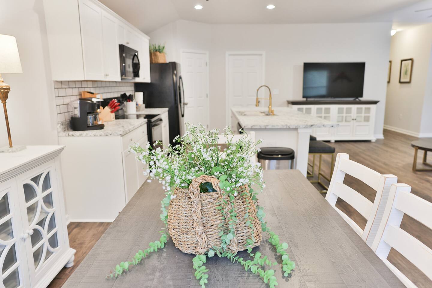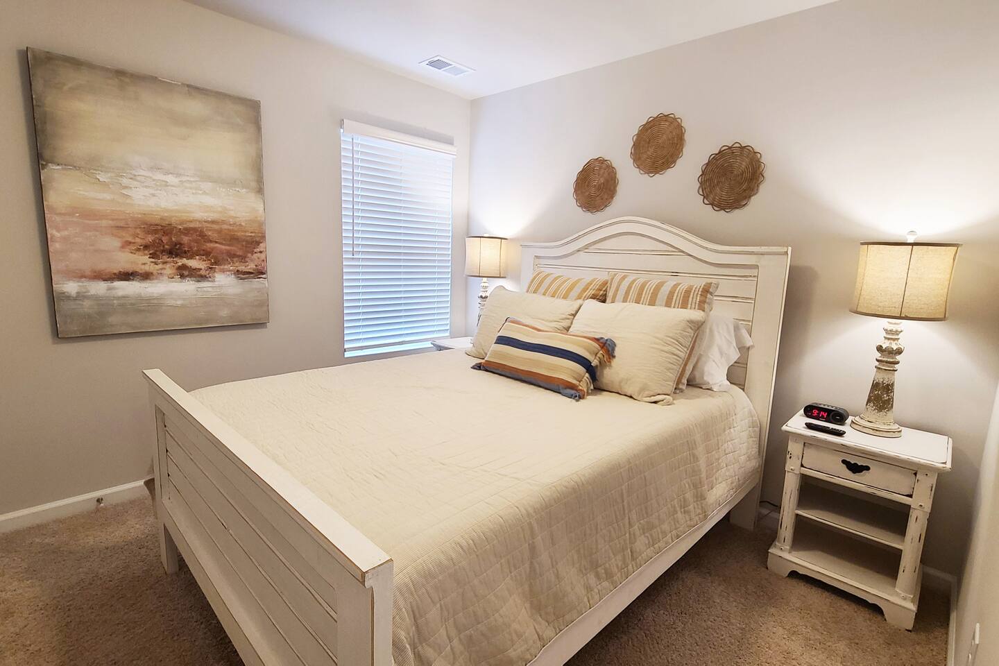 Beautiful new construction 4 bedroom home located in a very nice, family friendly neighborhood just minutes from I-20. This gorgeous home features the very popular open concept between the living room, dining room and the spacious kitchen. The living room features a new couch and matching loveseat, a round coffee and two end tables and a large 65 inch Smart Tv. The kitchen has bright white cabinets and lots of counter space with all new black appliances including a double door refrigerator, smooth top stove, dishwasher and microwave and comes fully stocked with smaller appliances including a toaster, blender and Keurig coffee maker. The kitchen also comes stocked with plenty of dishes and silverware, frying pans and bowls to cook a nice, home cooked meal. The dining room features a nice table with 4 chairs and a bench and a nice matching sideboard with stylish Forty West lamps. Just off the living room is the master bedroom with a new King size bed, chest, dresser and 2 night stands and also a nice desk and stool to work from if needed. The master bath has a tub shower combo, a nice vanity with a sitting bench and a nice size walk in closet. The second bedroom has a queen bed with 2 nightstands and a chest located inside the closet. The third bedroom also has a queen bed with 2 nightstands and a chest in the closet and the fourth bedroom has a full size bed with a dresser and mirror and a night stand and all 4 bedrooms come equipped with 43 inch Smart TVs and both bathrooms have extra toiletries including toothpaste and brush, hair dryer, soap, shampoo and conditioners just in case you forget something. The garage has been converted to a nice NASCAR themed GAMEROOM with a ping pong table, darts, cornhole, a 3 in 1 table with bowling, air hockey and shuffleboard and a child’s 3 in 1 table with a pool table, air hockey and ping ping. The rear patio also comes equipped with an outdoor couch, 2 chairs and a coffee table to enjoy your morning coffee. This home is very conveniently located to I-20, Honda, the Talladega Superspeedway, the world class Civilian Marksmanship Park in Talladega and just minutes from Logan Martin Lake and the Lincoln Landing Tournament Fishing Park. Plenty of restaurants, gas stations, grocery stores etc within a mile or two and the nice and new Lincoln City park with tennis, basketball and pickle ball courts, kids playground and a nice walking track that is less than a mile away.