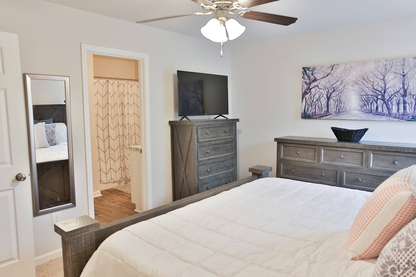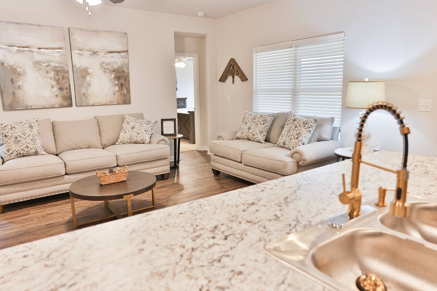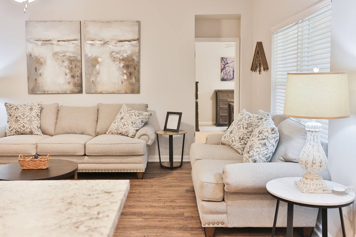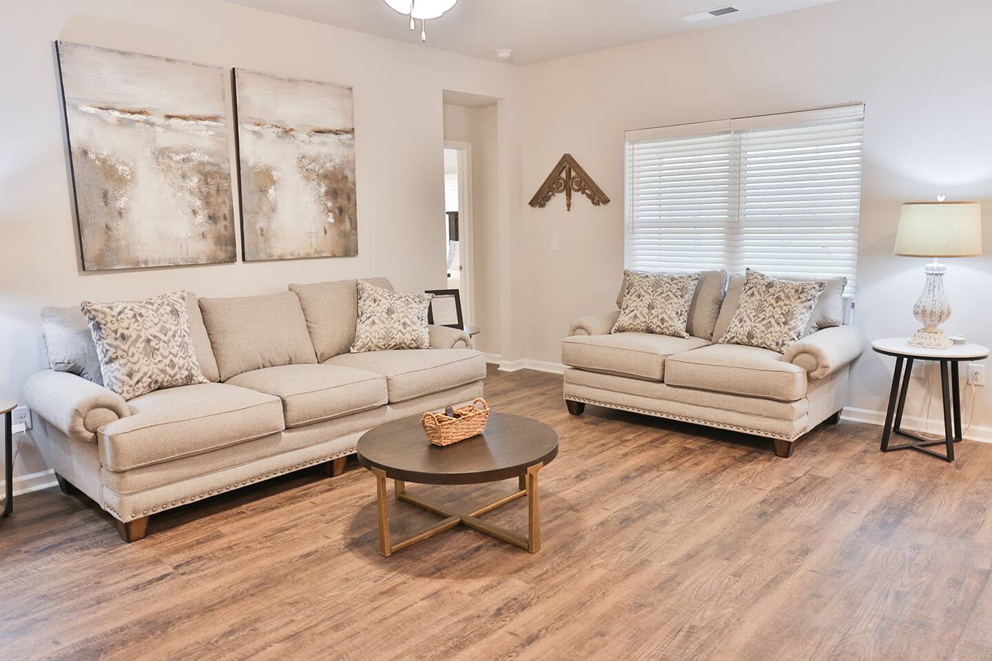 Beautiful new construction 4 bedroom home located in a very nice, family friendly neighborhood just minutes from I-20. This gorgeous home features the very popular open concept between the living room, dining room and the spacious kitchen. The living room features a new couch and matching loveseat, a round coffee and two end tables and a large 65 inch Smart Tv. The kitchen has bright white cabinets and lots of counter space with all new black appliances including a double door refrigerator, smooth top stove, dishwasher and microwave and comes fully stocked with smaller appliances including a toaster, blender and Keurig coffee maker. The kitchen also comes stocked with plenty of dishes and silverware, frying pans and bowls to cook a nice, home cooked meal. The dining room features a nice table with 4 chairs and a bench and a nice matching sideboard with stylish Forty West lamps. Just off the living room is the master bedroom with a new King size bed, chest, dresser and 2 night stands and also a nice desk and stool to work from if needed. The master bath has a tub shower combo, a nice vanity with a sitting bench and a nice size walk in closet. The second bedroom has a queen bed with 2 nightstands and a chest located inside the closet. The third bedroom also has a queen bed with 2 nightstands and a chest in the closet and the fourth bedroom has a full size bed with a dresser and mirror and a night stand and all 4 bedrooms come equipped with 43 inch Smart TVs and both bathrooms have extra toiletries including toothpaste and brush, hair dryer, soap, shampoo and conditioners just in case you forget something. The garage has been converted to a nice NASCAR themed GAMEROOM with a ping pong table, darts, cornhole, a 3 in 1 table with bowling, air hockey and shuffleboard and a child’s 3 in 1 table with a pool table, air hockey and ping ping. The rear patio also comes equipped with an outdoor couch, 2 chairs and a coffee table to enjoy your morning coffee. This home is very conveniently located to I-20, Honda, the Talladega Superspeedway, the world class Civilian Marksmanship Park in Talladega and just minutes from Logan Martin Lake and the Lincoln Landing Tournament Fishing Park. Plenty of restaurants, gas stations, grocery stores etc within a mile or two and the nice and new Lincoln City park with tennis, basketball and pickle ball courts, kids playground and a nice walking track that is less than a mile away.