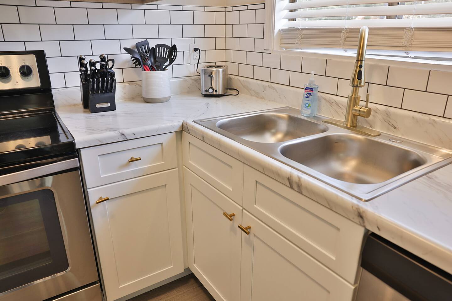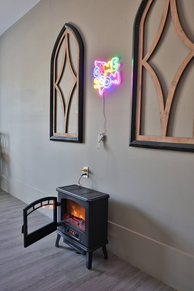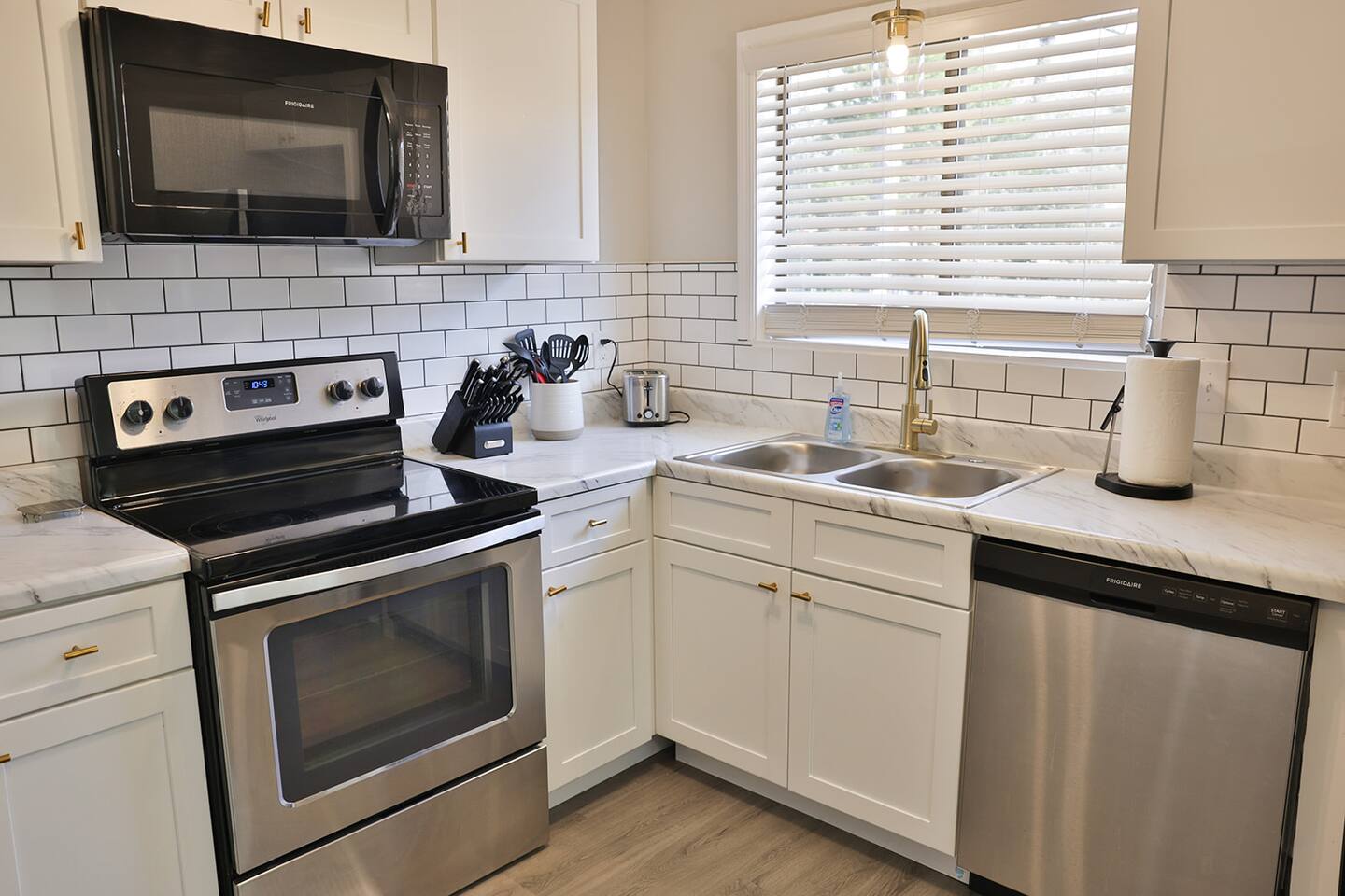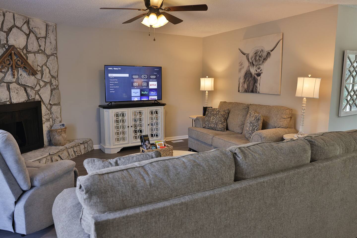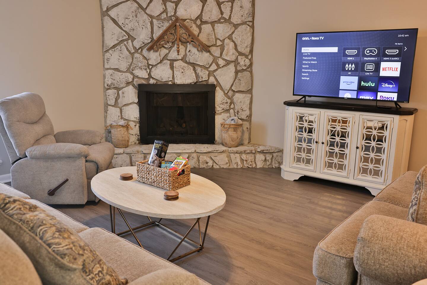 As you walk in the front door you will enjoy the open concept between the living and dining rooms in this recently updated rancher. The living room has a nice couch, loveseat and a recliner with a nice wood burning rock fireplace, stylish coffee and end tables and a 60 inch Smart Tv. The dining room has a nice table with extra leaves, 8 chairs and a matching sideboard. The kitchen features bright white cabinets, stainless appliances including a refrigerator, electric stove, dishwasher and microwave, a nice subway tiled backsplash and a coffee bar with coffee, creamer, sugar and other complimentary condiments. There are plenty of dishes, silverware, pots and pans etc if you want to prepare a nice, home cooked meal. The master bedroom has a nice King bed with 2 dressers, 2 nightstands, a desk, 60 inch Smart Tv and a private bathroom with a fully tiled walk in shower, a new toilet and a new vanity and mirror. The second bedroom has a queen bed with 2 side tables, mirrored dresser and a 50 inch Smart Tv. The third bedroom has 2 twin beds, nightstand and a chest of drawers with a Smart Tv. The hall bathroom has new tile floors, new vanity and toilet and a tub shower combo with a tiled tub surround. There is some individual shampoo, conditioner, soap, toothbrush etc available in case you happen to forget some of those items. There is a nice Gameroom just off the kitchen with a pool table, darts, cornhole boards etc and a nice big screen TV and some some extra seating. There is a nice sized laundry room with a washer and dryer, iron and board and with washing powders if you need to wash some clothes. This home is located in a very convenient location that is less than 2 miles from I-20 and Choccolocco Park as well as grocery stores, gas stations and restaurants.