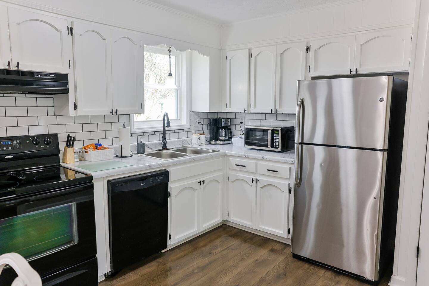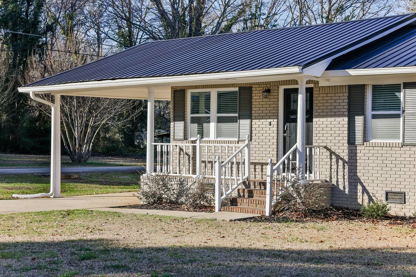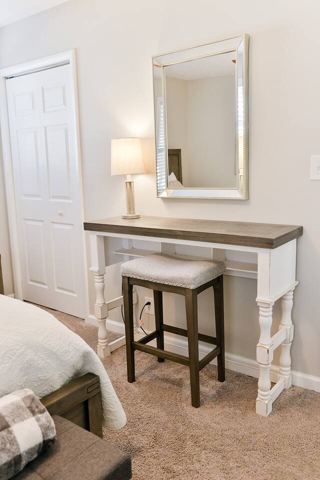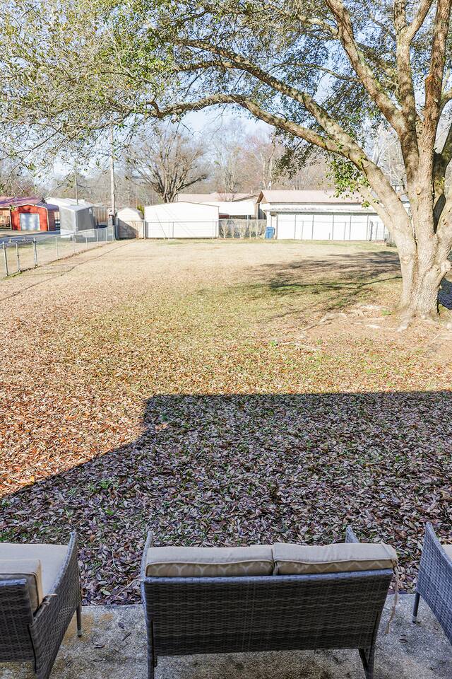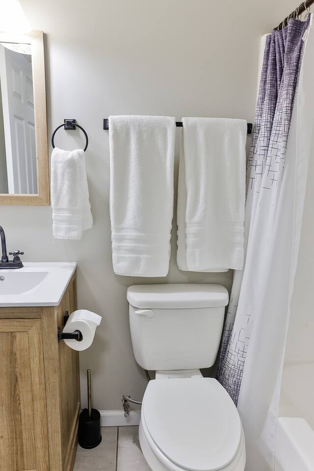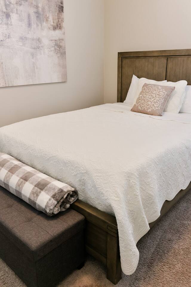The Merrimac house is a 3br/2ba brick rancher that has completely updated With a new metal roof, all new windows, all new flooring, and all new oil rubbed bronze lighting in plumbing fixtures. It has a nice living room with a couch, loveseat and recliner with a 55” smart Tv and features an open concept to the kitchen and dining areas. The kitchen has bright white cabinets, and new countertops and comes with all kitchen appliances including refrigerator, stove, dishwasher, microwave and coffee pot and all the condiments. It also has a nice pantry and a table with up to six chairs with the leaf put in and a nice size laundry room with washer, dryer, ironing and board. All three bedrooms have fresh paint and carpet and the master bedroom has a queen bed with nightstand, a nice TV stand with an electric fireplace with a 40 inch smart TV and has its own private bathroom with a completely tiled walk-in shower, new vanity, and new toilet. The second bedroom features a queen size poster bed with two nightstands and a chest with a 40 inch smart TV and the third bedroom features a full over twin trundle bed with a nightstand and a 40 inch smart TV and a small chest inside the closet. It has a really nice and level fenced in backyard with plenty of room for the children to play and an outdoor sofa and 2 chairs to relax and enjoy the outdoors while on your visit.