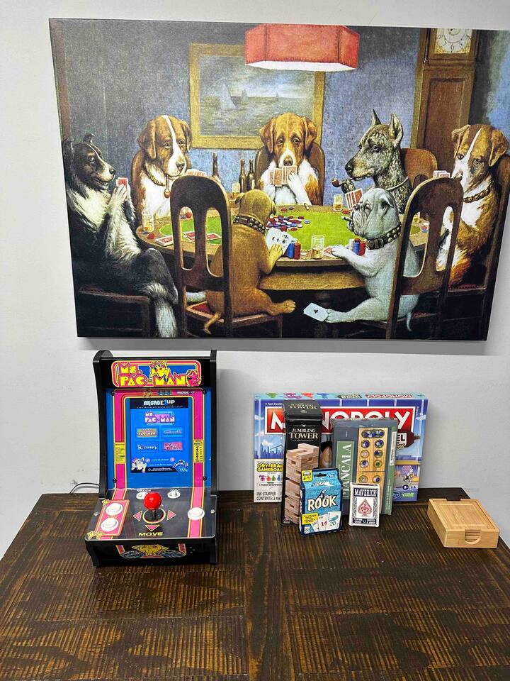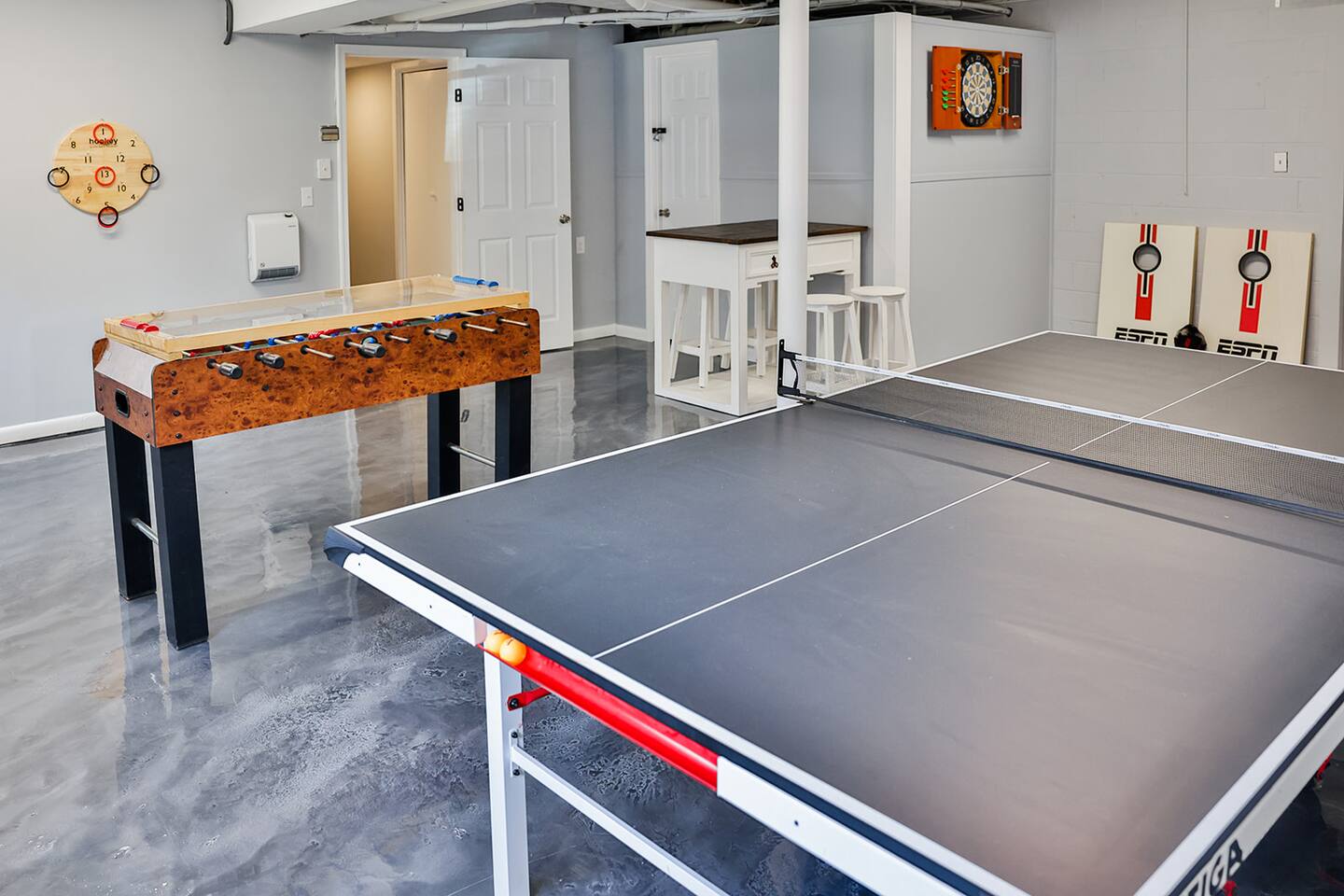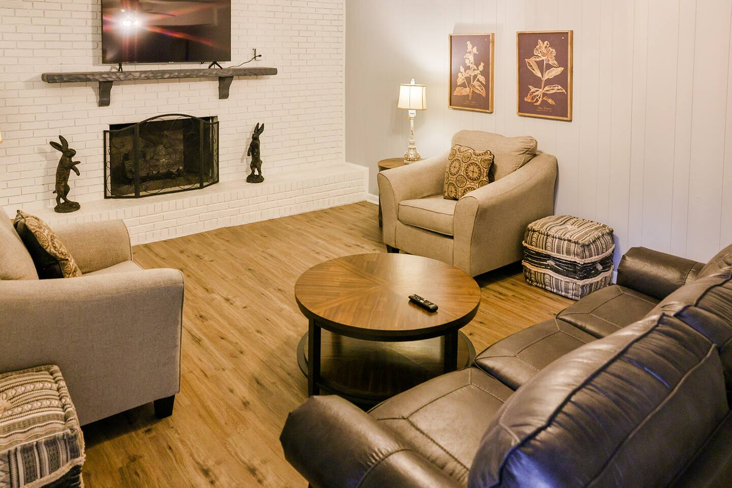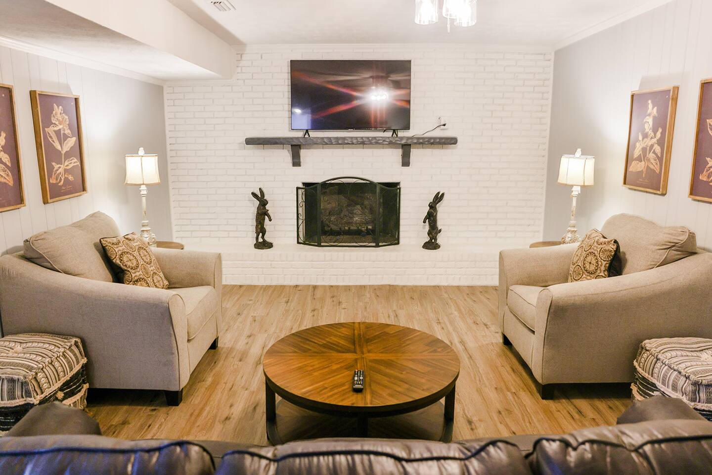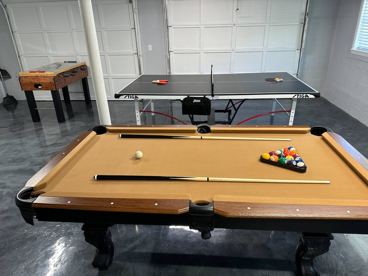 This large home has been completely remodeled with very spacious rooms and very tastefully decorated. It has 2 large living areas plus a very large sunroom so it has plenty of room for all the family. The sunroom is huge and is all windows with tons of natural light with a small breakfast set and lots of extra seating to enjoy that morning coffee or relax and read a book. Both living rooms have a nice couch and loveseat, coffee and 2 end tables, extra upholstered chairs for seating and nice Flat sreen Smart Tvs to watch your favorite shows or movies. Upstairs features 3 large bedrooms (2 kings and 1 queen) and 2 full baths plus the kitchen, formal dining room, living room and a huge sunroom. Downstairs features a 4th bedroom with a twin and full bed with a Smart Tv, a second living room with a brick fireplace with gas logs and 55 inch smart tv with a work desk and a 3rd full bathroom. The large master bedroom features a very nice KING size bed with two nightstands, large dresser, 2 extra chairs for seating and a large 55 inch Smart Tv. It also has its own en-suite bathroom with a new vanity, new toilet and a nice step in shower. The second bedroom also has a KING bed with 2 nightstands, large dresser and a 55 inch Smart Tv. The 3rd bedroom has a QUEEN bed with a large dresser and mirror and 2 night stands and a Smart Tv and the 4th bedroom downstairs has a full and a twin bed with a chest, night stand and a Smart Tv. The kitchen comes fully equipped with lots of utensils, pots and pans, Keurig coffee maker with all the condiments, toaster, blender, etc and all kitchen appliances ( refrigerator, stove, dishwasher and microwave). This kitchen has all you need to provide a nice, home cooked meal for the entire family. There is a nice formal dining room just off the kitchen and upstairs living room that features a nice dining table and 6 chairs, a matching sideboard and is tastefully decorated with nice lamps and wall decor with a splash of greenery to enhance the space. The garage is converted into a reallly nice GAMEROOM with a pool table, ping pong table, foosball table, darts, cornhole boards, Pac-Man table top game and a Hookey game for the children. This is a great addition to this house and a place for the whole family to gather and share some quality time together. There are also several classic card games available.