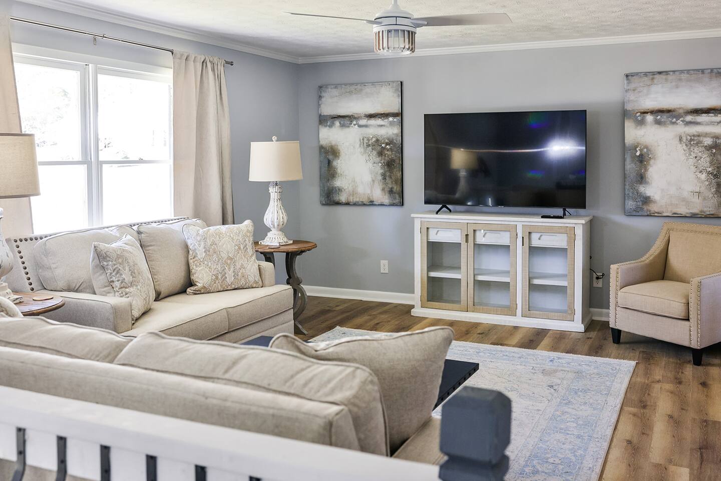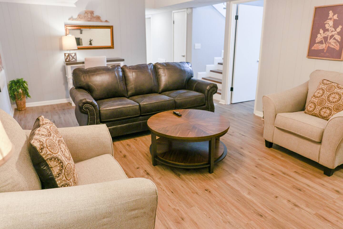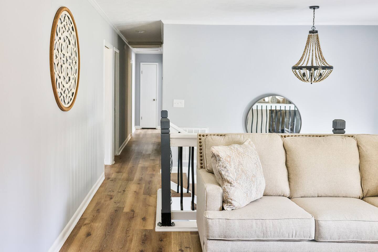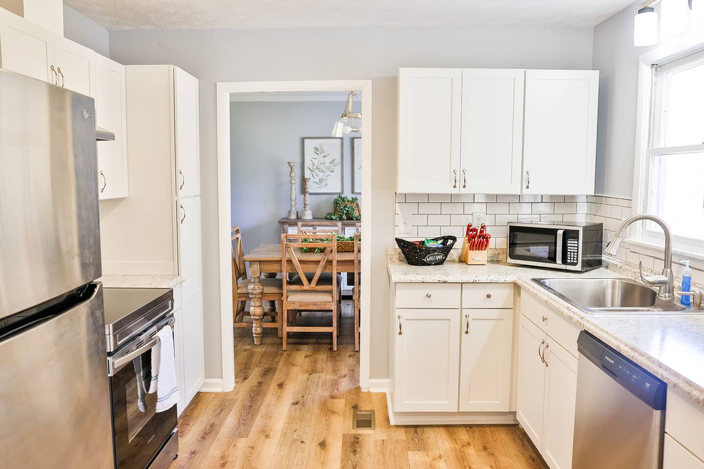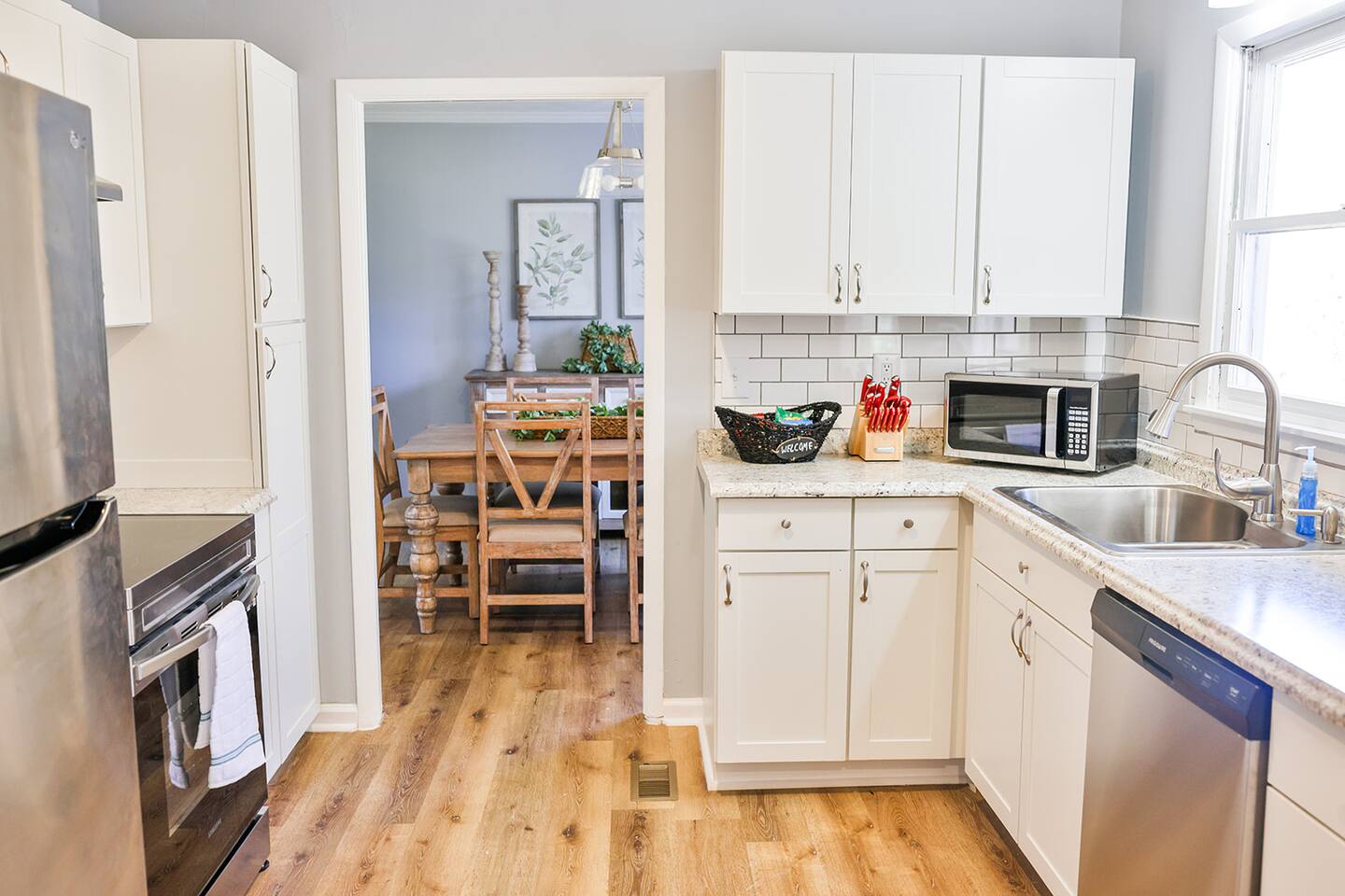 This large home has been completely remodeled with very spacious rooms and very tastefully decorated. It has 2 large living areas plus a very large sunroom so it has plenty of room for all the family. The sunroom is huge and is all windows with tons of natural light with a small breakfast set and lots of extra seating to enjoy that morning coffee or relax and read a book. Both living rooms have a nice couch and loveseat, coffee and 2 end tables, extra upholstered chairs for seating and nice Flat sreen Smart Tvs to watch your favorite shows or movies. Upstairs features 3 large bedrooms (2 kings and 1 queen) and 2 full baths plus the kitchen, formal dining room, living room and a huge sunroom. Downstairs features a 4th bedroom with a twin and full bed with a Smart Tv, a second living room with a brick fireplace with gas logs and 55 inch smart tv with a work desk and a 3rd full bathroom. The large master bedroom features a very nice KING size bed with two nightstands, large dresser, 2 extra chairs for seating and a large 55 inch Smart Tv. It also has its own en-suite bathroom with a new vanity, new toilet and a nice step in shower. The second bedroom also has a KING bed with 2 nightstands, large dresser and a 55 inch Smart Tv. The 3rd bedroom has a QUEEN bed with a large dresser and mirror and 2 night stands and a Smart Tv and the 4th bedroom downstairs has a full and a twin bed with a chest, night stand and a Smart Tv. The kitchen comes fully equipped with lots of utensils, pots and pans, Keurig coffee maker with all the condiments, toaster, blender, etc and all kitchen appliances ( refrigerator, stove, dishwasher and microwave). This kitchen has all you need to provide a nice, home cooked meal for the entire family. There is a nice formal dining room just off the kitchen and upstairs living room that features a nice dining table and 6 chairs, a matching sideboard and is tastefully decorated with nice lamps and wall decor with a splash of greenery to enhance the space. The garage is converted into a reallly nice GAMEROOM with a pool table, ping pong table, foosball table, darts, cornhole boards, Pac-Man table top game and a Hookey game for the children. This is a great addition to this house and a place for the whole family to gather and share some quality time together. There are also several classic card games available.