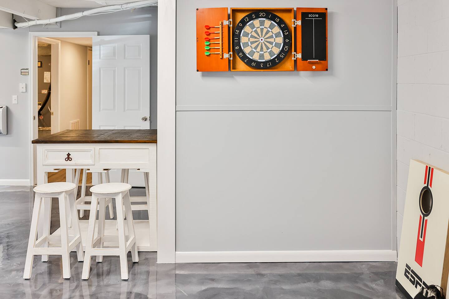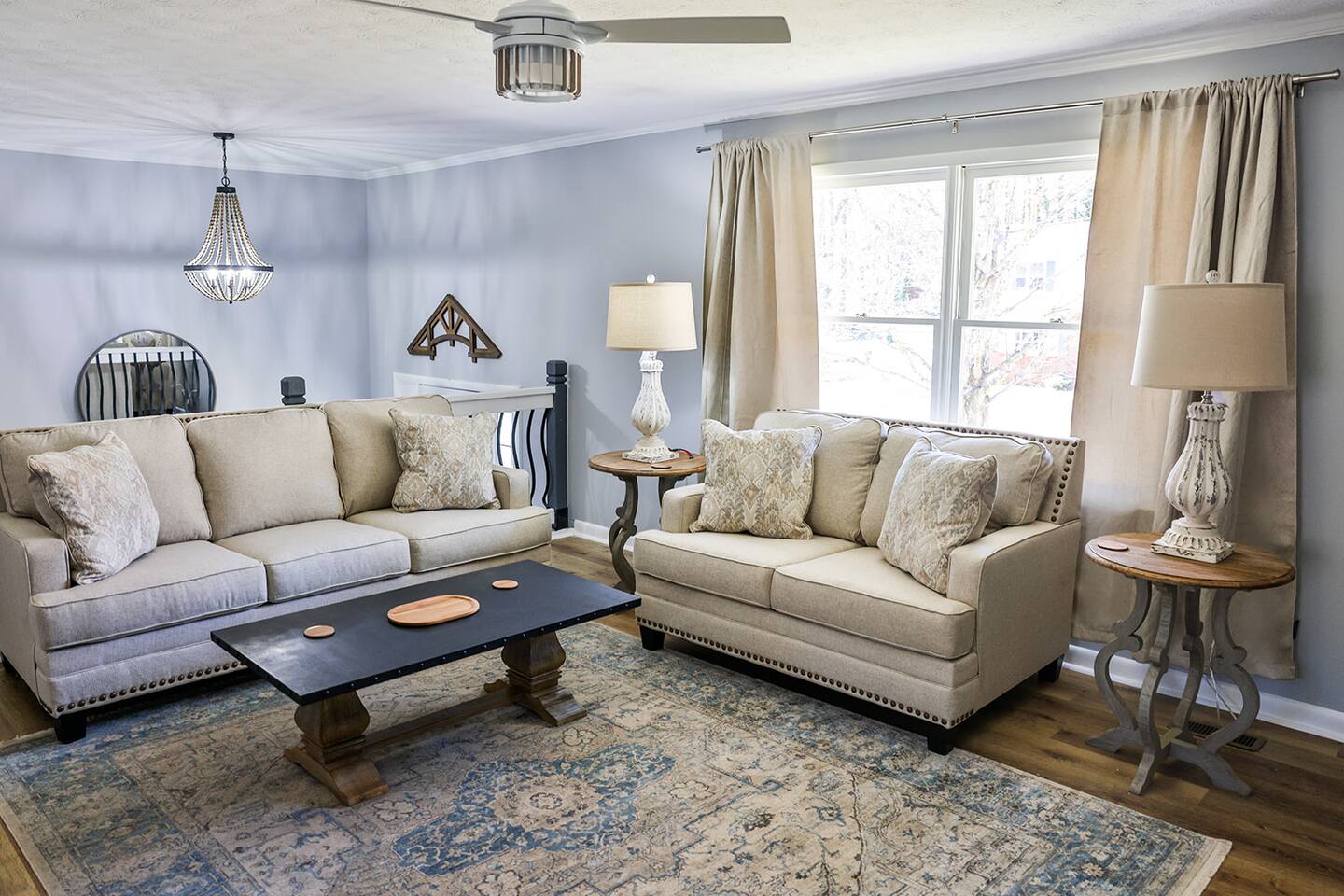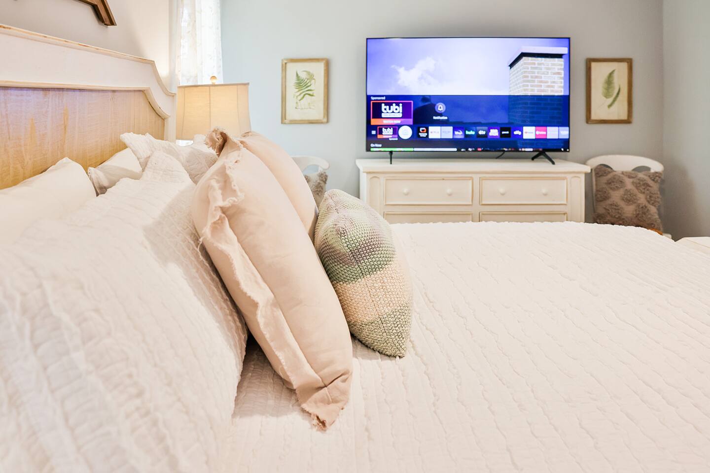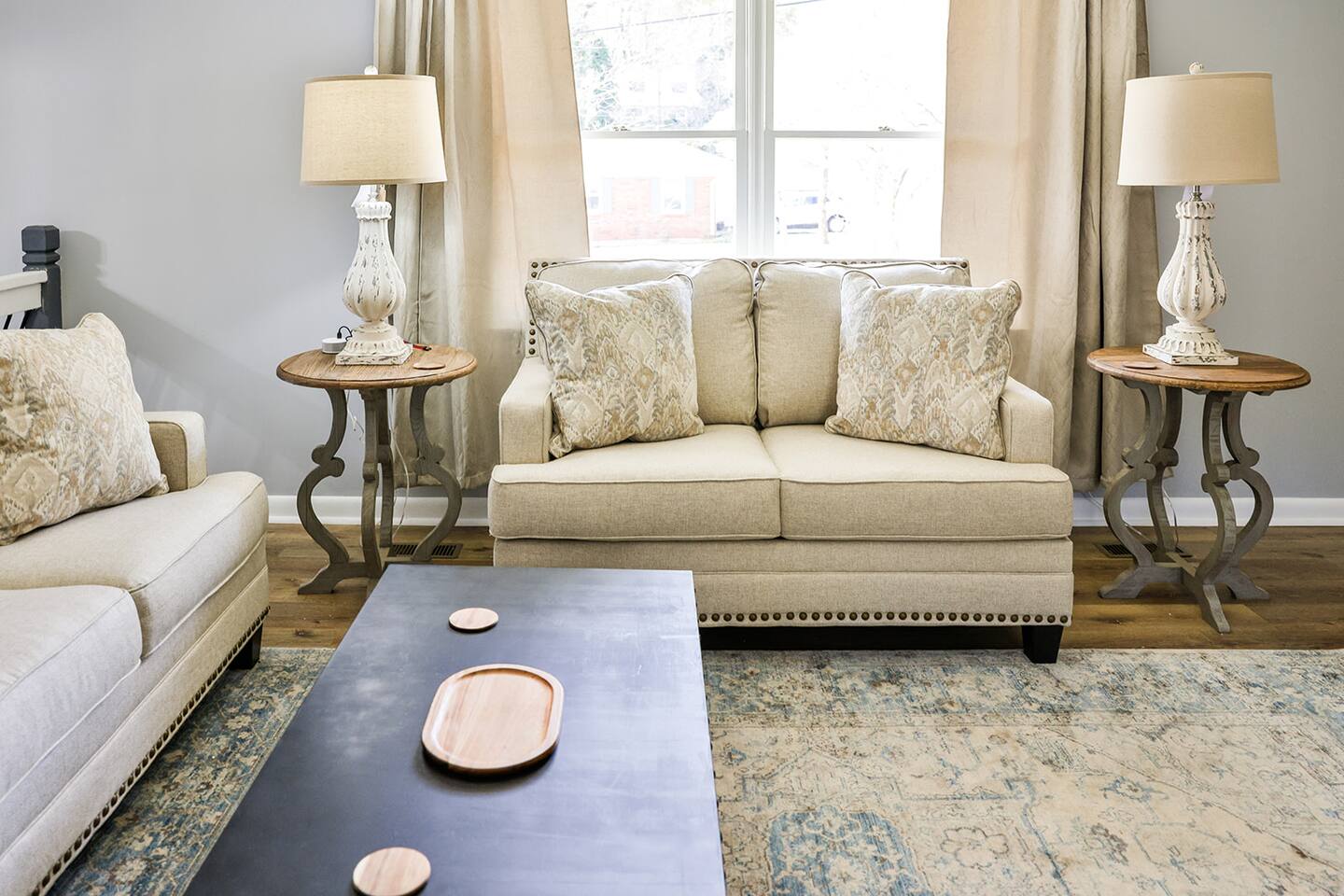 This large home has been completely remodeled with very spacious rooms and very tastefully decorated. It has 2 large living areas plus a very large sunroom so it has plenty of room for all the family. The sunroom is huge and is all windows with tons of natural light with a small breakfast set and lots of extra seating to enjoy that morning coffee or relax and read a book. Both living rooms have a nice couch and loveseat, coffee and 2 end tables, extra upholstered chairs for seating and nice Flat sreen Smart Tvs to watch your favorite shows or movies. Upstairs features 3 large bedrooms (2 kings and 1 queen) and 2 full baths plus the kitchen, formal dining room, living room and a huge sunroom. Downstairs features a 4th bedroom with a twin and full bed with a Smart Tv, a second living room with a brick fireplace with gas logs and 55 inch smart tv with a work desk and a 3rd full bathroom. The large master bedroom features a very nice KING size bed with two nightstands, large dresser, 2 extra chairs for seating and a large 55 inch Smart Tv. It also has its own en-suite bathroom with a new vanity, new toilet and a nice step in shower. The second bedroom also has a KING bed with 2 nightstands, large dresser and a 55 inch Smart Tv. The 3rd bedroom has a QUEEN bed with a large dresser and mirror and 2 night stands and a Smart Tv and the 4th bedroom downstairs has a full and a twin bed with a chest, night stand and a Smart Tv. The kitchen comes fully equipped with lots of utensils, pots and pans, Keurig coffee maker with all the condiments, toaster, blender, etc and all kitchen appliances ( refrigerator, stove, dishwasher and microwave). This kitchen has all you need to provide a nice, home cooked meal for the entire family. There is a nice formal dining room just off the kitchen and upstairs living room that features a nice dining table and 6 chairs, a matching sideboard and is tastefully decorated with nice lamps and wall decor with a splash of greenery to enhance the space. The garage is converted into a reallly nice GAMEROOM with a pool table, ping pong table, foosball table, darts, cornhole boards, Pac-Man table top game and a Hookey game for the children. This is a great addition to this house and a place for the whole family to gather and share some quality time together. There are also several classic card games available.