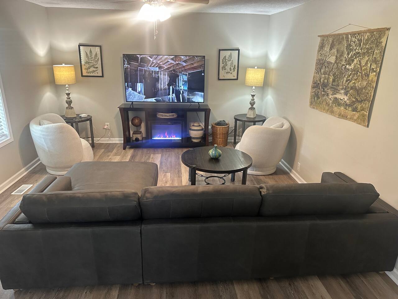 Gorgeous, totally remodeled four bedroom and three full bath house with a nice game room for all of the family to enjoy. As you walk in the front door it features a nice open floor plan between the living room, kitchen and dining room with a nice island in the kitchen. The living room comes with a couch and two recliners and a 60 inch smart TV. Just off the living room is the dining room that has a table and eight chairs to enjoy your evening meals. It has a very large kitchen with lots of cabinetry and is stocked with a refrigerator, electric smooth top stove, dishwasher, and a microwave. It also comes with plenty of pots and pans and cooking utensils if you want to prepare a nice home-cooked meal. On the main floor, there is a large master suite with a king size bedroom suit with a nice walk out rear patio. The master also has a very large walk-in closet and a large master bathroom with double vanities and a fully tiled standup shower. The second bedroom also is a king suite with a large dresser and two nightstands and a 55 inch smart TV. The third bedroom on the main floor is a queen suite with two nightstands and a five drawer chest with a smart TV as well. There is also a large laundry room on the main floor with a full size washer and dryer, iron and board etc and another full bathroom with new tile floors, a new vanity and toilet and a tub shower combination. Downstairs features the fourth bedroom that has two twin beds, a nice dresser and nightstand and a 55 inch smart TV. There is a full bathroom downstairs that has new tile floors and new vanity and toilet and a nice game room with ping-pong, air hockey, Shuffleboard and an electronic pong pong game. This home has a very nice layout and has completely updated and located on a quiet family friendly street.